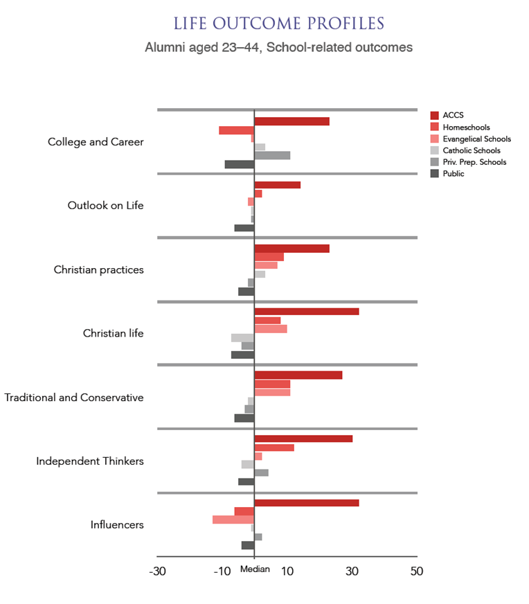 The authors of the study conclude that, with respect to both “spiritual and life” outcomes and “world-impact” outcomes, young people who attended ACCS institutions were far in advance of those graduating from other categories of schools.
