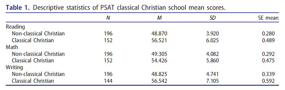 Vaughan, Christy Anne. (2020). “Differences of Mean Scores on the Preliminary Scholastic Aptitude Test (PSAT) for Classical Christian Schools Compared to Non-Classical Christian Schools.” Journal of Research on Christian Education 28:3, 286-308. https://doi.org/10.1080/10656219.2019.1704326.